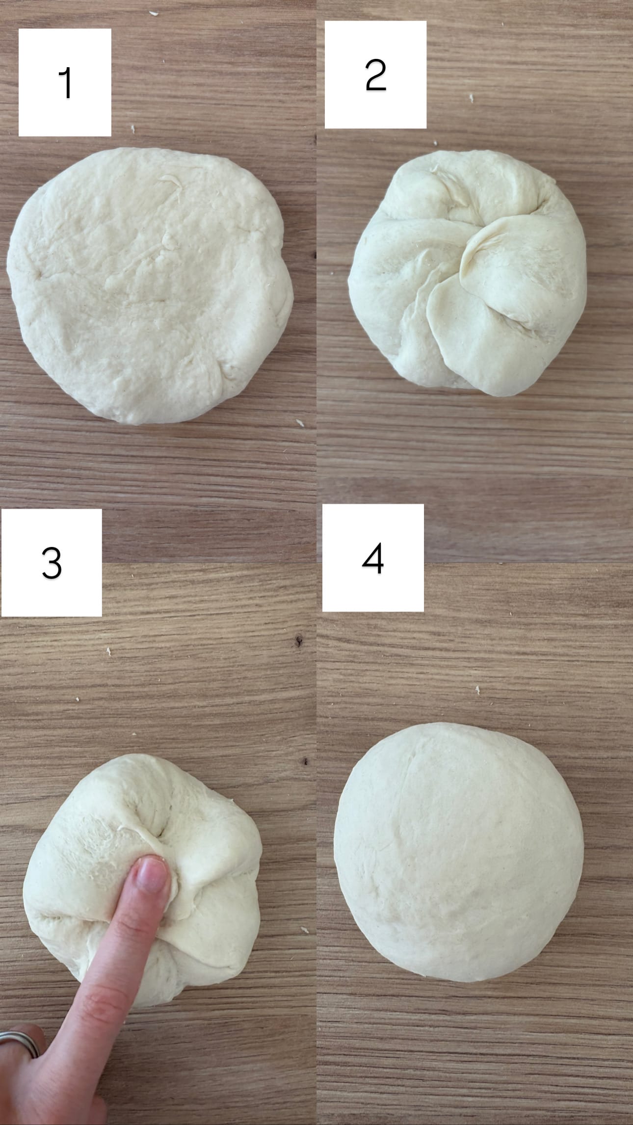 - Aplatizăm ușor fiecare bilă, formând mici discuri. Tragem de marginile fiecărui disc și le aducem spre centru, pentru a crea tensiune în aluat. Repetăm această împachetare de două ori, astfel încât bilele să fie ferme și bine formate. Le așezăm cu partea împachetată în jos pe blatul de lucru și, dacă este necesar, le mai rotunjim ușor pentru a păstra tensiunea.