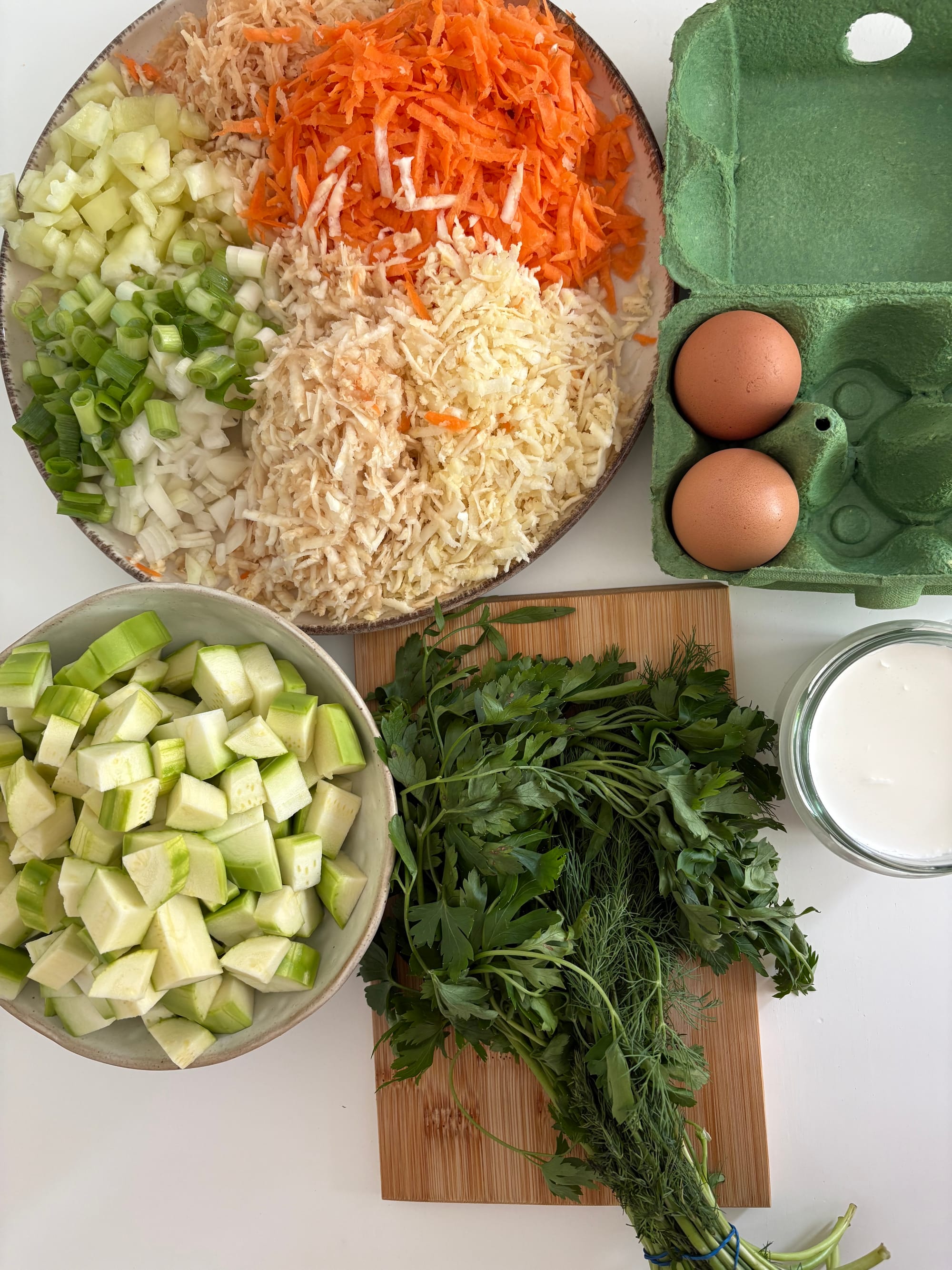 - Dăm pe răzătoarea mare sau tocăm la blender morcovul, țelina, păstârnacul și cartoful (pe acesta îl putem rade mai mărunt). Tocăm cubulețe ceapa și ardeiul, iar dovleceii îi tăiem în bucăți mai mari. Mărunțim mărarul și pătrunjelul cu ajutorul unui cuțit.
