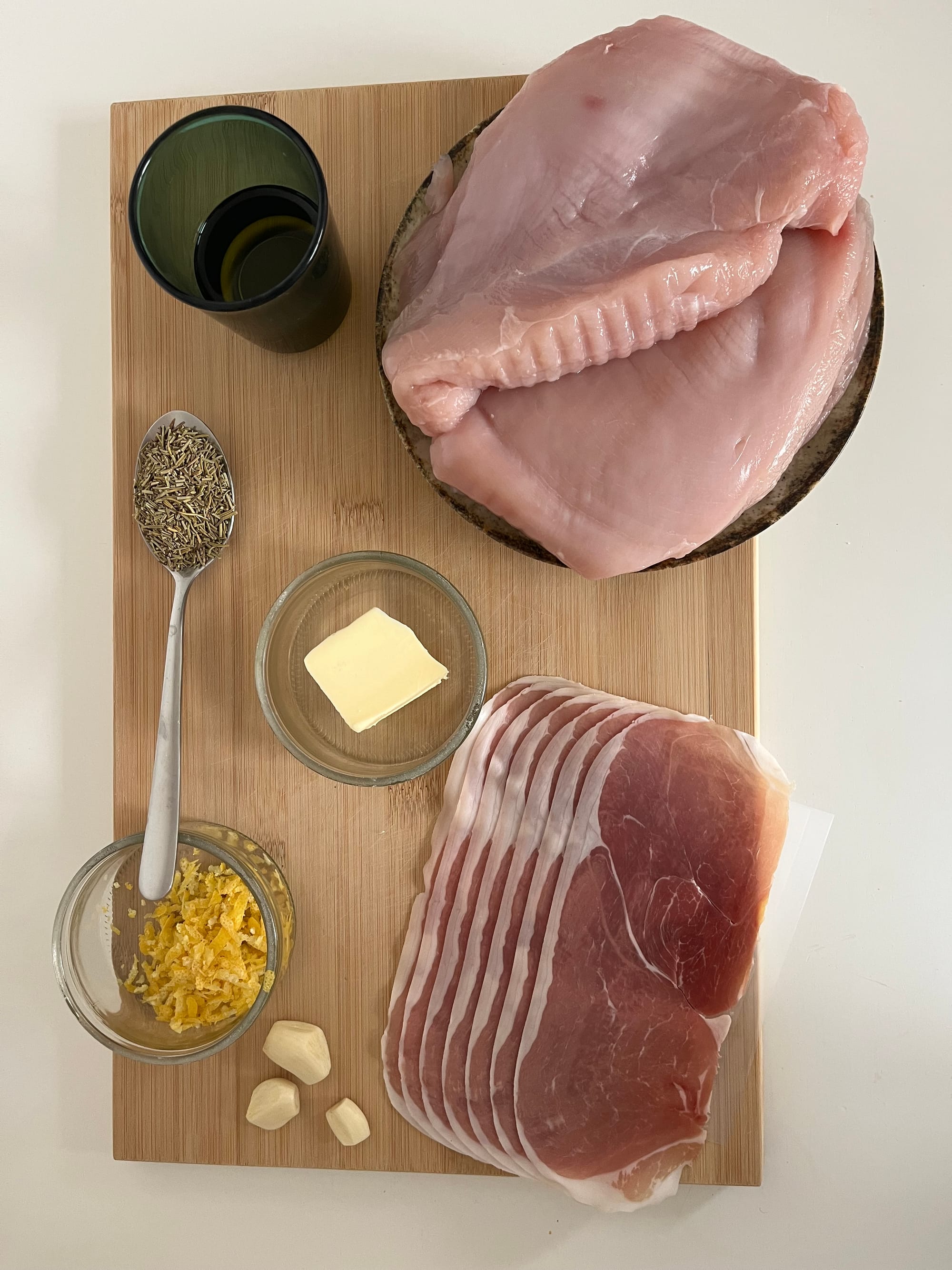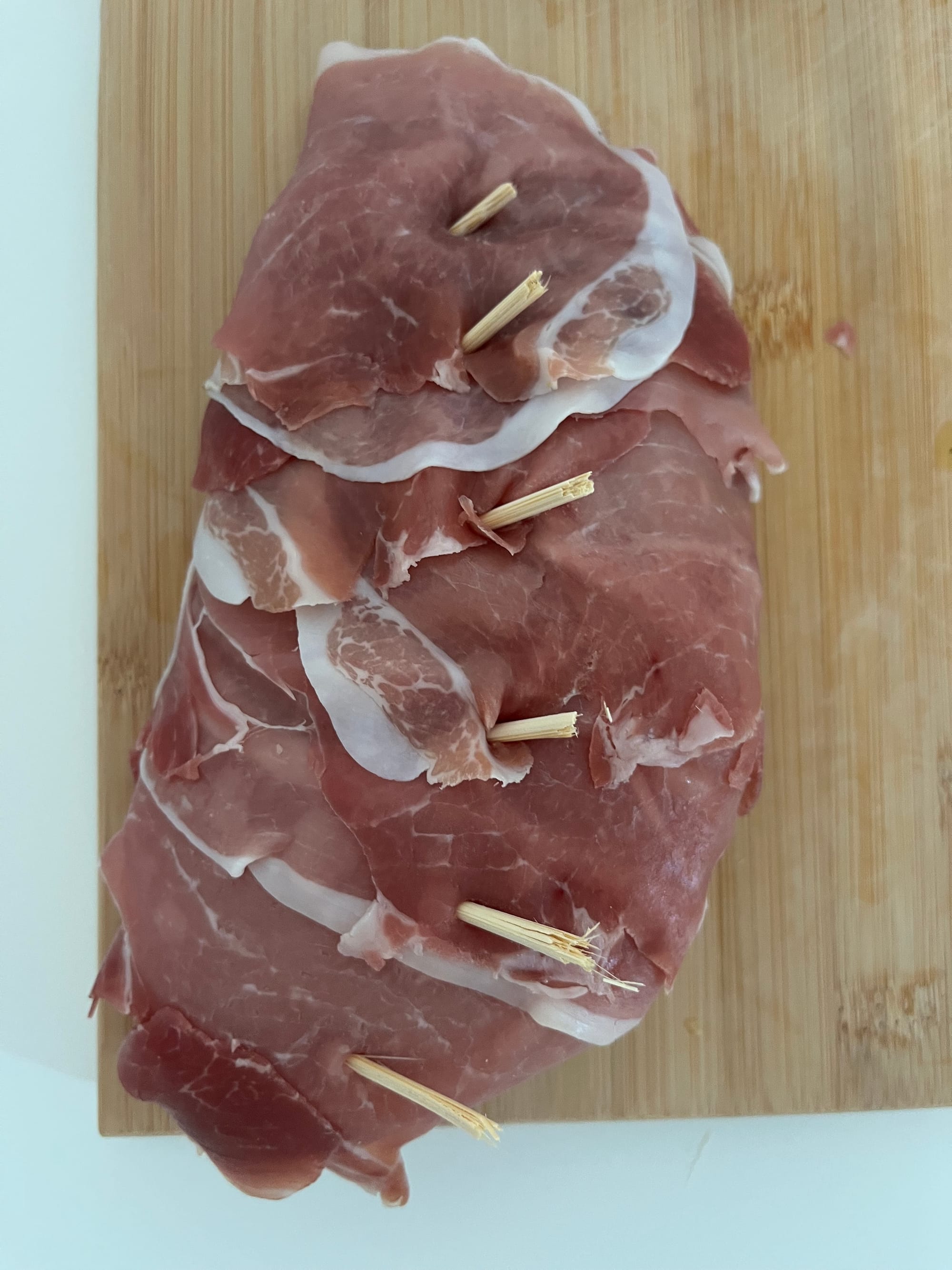 - Învelim curcanul în felii de prosciutto și fixăm din loc în loc cu ajutorul unor scobitoari de bucătărie.
