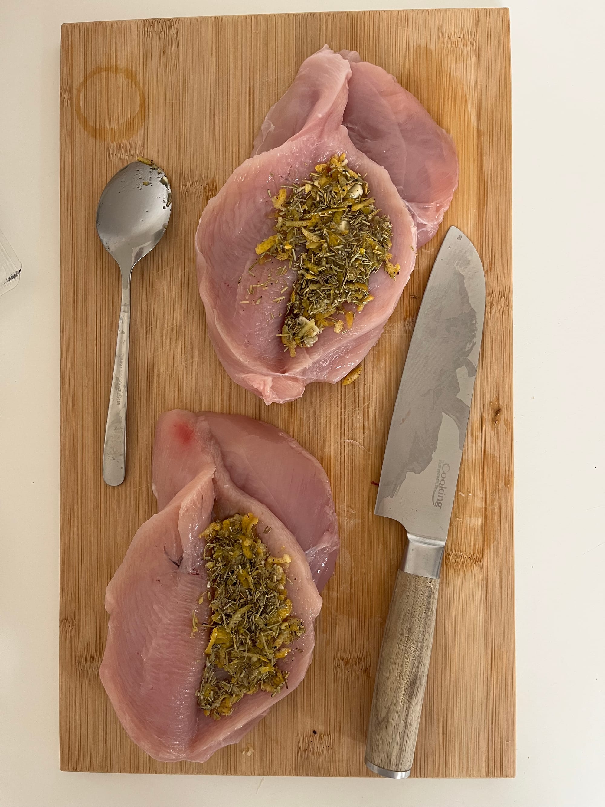 - Luăm pieptul de curcan și îi facem cu ajutorul unui cuțit bine ascuțit un buzunar în cea mai groasă parte a lui, fără să ajungem să-l tăiem în două.